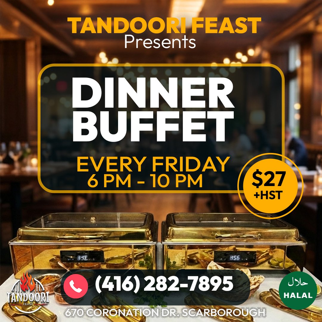 This buffet is almost a full display of everything we proudly offer at Tandoori Feast. Every dish is prepared with love, care, and fine-quality ingredients, staying true to authentic flavors. Enjoy our most-loved specialties such as famous Sindhi Biryani & Pulao, Chicken Karahi, Goat Curry, Korma, Halwa Puri, Haleem, along with vegetarian favorites like Butter Paneer and Palak Aloo, and BBQ classics including Chicken Tikka and Kababs. Our menu rotates regularly, so each visit brings something new—while still letting you enjoy the flavors our guests love the most.